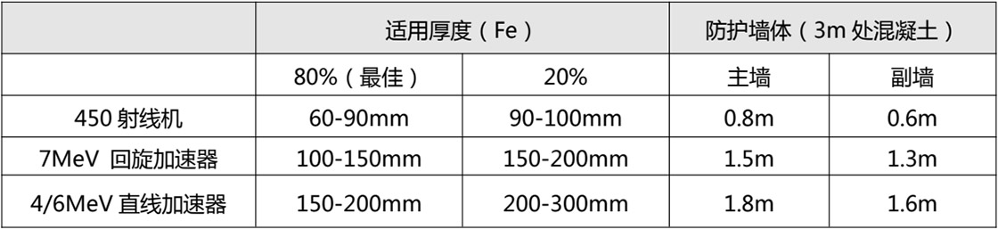 設(shè)備體積小、重量輕,為直線加速器的 1/4,輻射器重量?jī)H 100kg,位置擺放便捷,透照較大工件,運(yùn)動(dòng)靈活。由于不需要直線加速器所配置的行車(chē)和軛架,雖然防護(hù)墻厚度與直線加速器基本相等(1.5m.,防護(hù)室的高度、面積可大大縮小,防護(hù)室建設(shè)成本為直線加速器的 50%。調(diào)制器部分以風(fēng)冷替代水冷,降低故障環(huán)節(jié),受環(huán)境影響較小。